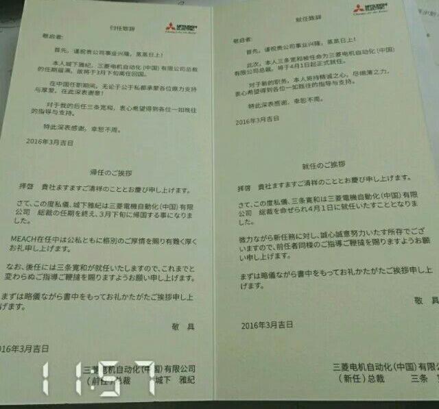 三菱電機自動化(中國)有限公司原總裁城下雅紀任期到2016年3月31日滿,4月1日起新任總裁三條寬和上任