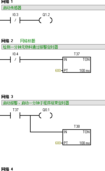 持續一分鐘無物料通過則啟動報警器,同時啟動第二個定時器,