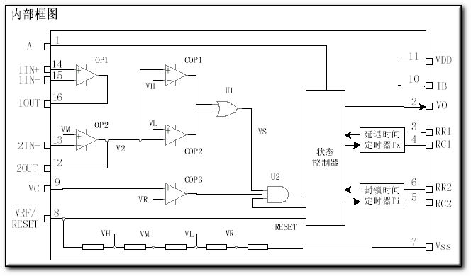 內部電路圖和管腳說明:管腳說明 引腳名稱功能說明 1A 可重復觸發和不可重復觸發選擇端。當A為“1”時,允許重復觸發;反之,不可重復觸發 2 VO 控制信號輸出端。由VS的上跳變沿觸發,使Vo輸出從低電平跳變到高電平時視為有效觸發。在輸出延遲時間Tx之外和無VS的上跳變時,Vo保持低電平狀態。 3 RR1 輸出延遲時間Tx的調節端 4 RC1 輸出延遲時間Tx的調節端 5 RC2 觸發封鎖時間Ti的調節端 6 RR2 觸發封鎖時間Ti的調節端 7 VSS 工作電源負端 8 VRF 參考電壓及復位輸入端。通常接VDD,當接“0”時可使定時器復位 9 VC 觸發禁止端。當Vc<VR時禁止觸發;當Vc>VR時允許觸發(VR≈0.2VDD) 10 IB 運算放大器偏置電流設置端 11 VDD 工作電源正端 12 2OUT 第二級運算放大器的輸出端 13 2IN- 第二級運算放大器的反相輸入端 14 1IN+ 第一級運算放大器的同相輸入端 15 1IN- 第一級運算放大器的反相輸入端 16 1OUT 第一級運算放大器的輸出端 可是就我上面提出的問題怎么理解呢? |