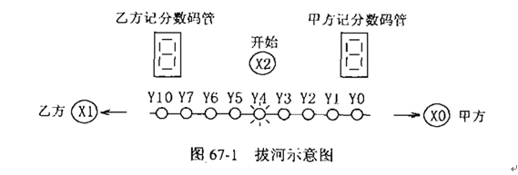 用9個(gè)燈排成一條直線,開始時(shí),按下開始按鈕,中間一個(gè)燈亮表示拔河繩子的中游戲的雙方各持一個(gè)按鈕,游戲開始,雙方都快速不斷地按動(dòng)按鈕,每按一次按鈕,亮點(diǎn)向本方移動(dòng)一位。當(dāng)亮點(diǎn)移動(dòng)到本方的端點(diǎn)時(shí),這一方荻勝,并保持燈一直亮,并得一分,雙方的按鈕不再起作用。用兩個(gè)數(shù)碼管顯示雙方得分.