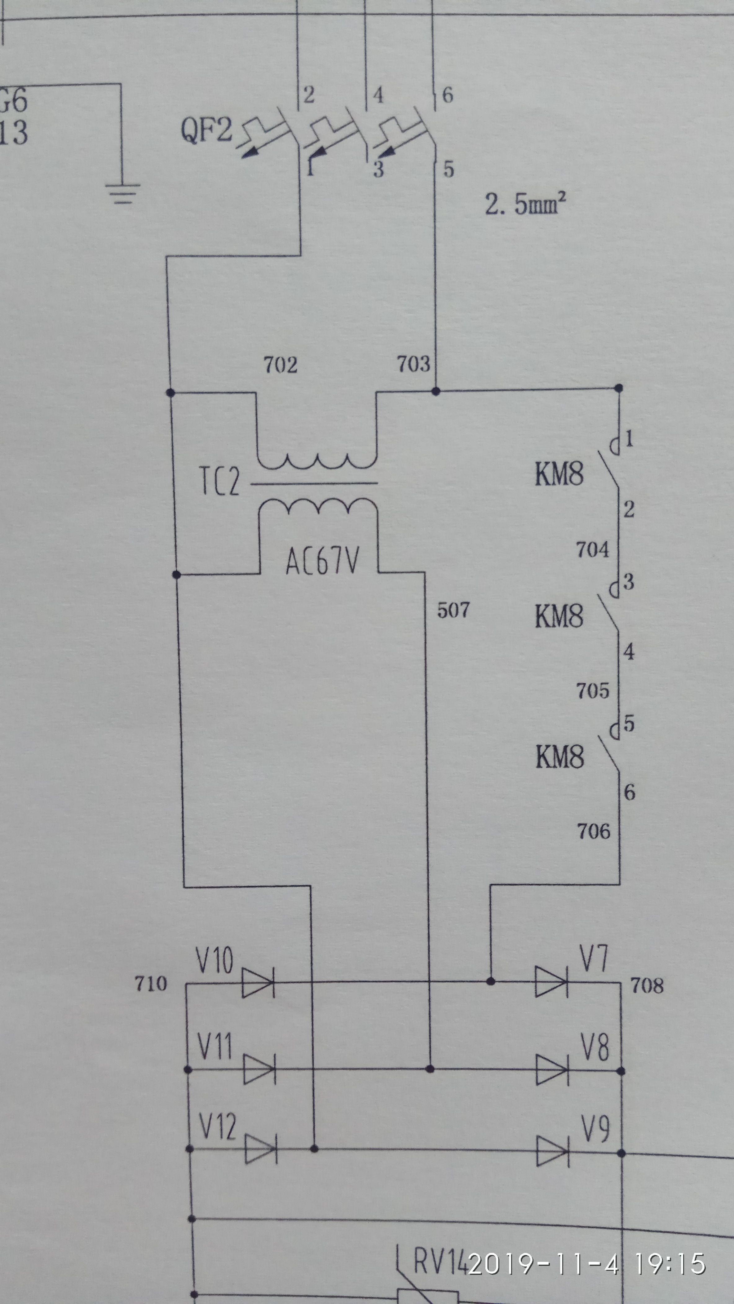 級別: 工控俠客   | 如果進(jìn)線2、6是接380v,KM8閉合時的直流輸出電壓應(yīng)該是380*0.9=342v左右(橋式整流)。 507的對地電壓則要看兩組線圈相對繞線方向(是否同名端),大概是單相電壓±67v。 |