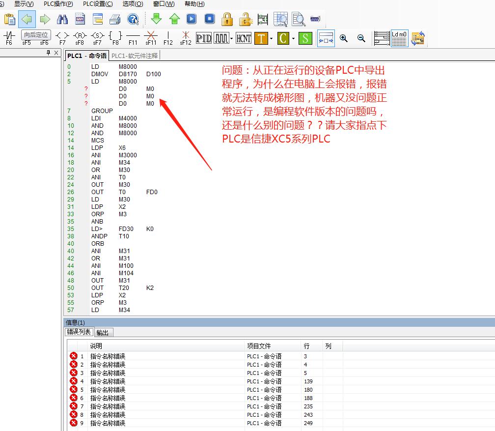 前兩天,從現場正常運行的設備中的PLC拷出程序,為什么在電腦端顯示程序有錯誤,機器又可以正常運行,麻煩大家看下是什么問題,PLC是信捷XC5系列