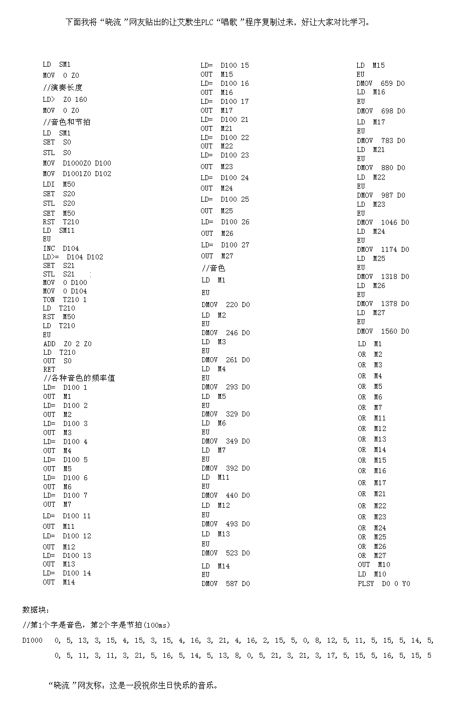 前幾天看到一個帖子 PLC上接個喇叭  可以做個程序讓它唱歌。要用晶體管的PLC   可惜我的PLC是繼電器的。哪個哥們能不能做一個來讓大家開眼界?