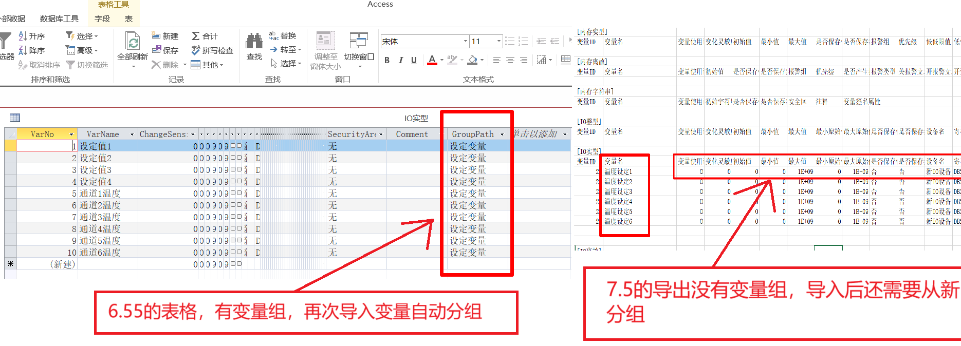 下面這張圖是6.55和7.5導出EXCEL的對比,6.55的變量表有 “變量組”這一欄的,7.5沒有。