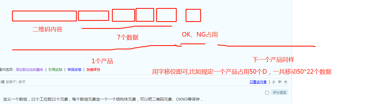 ![]() 我想到的還是用位移指令把二維碼數據做位移,根據二維碼數據長度分配所需字數,然后一個字用來存檢測結果,這兩組數據所占字數相加就是每個工位需要的字數,就是圖中指令中的N2,再乘以22工位,就是圖中指令中的N1。 |
