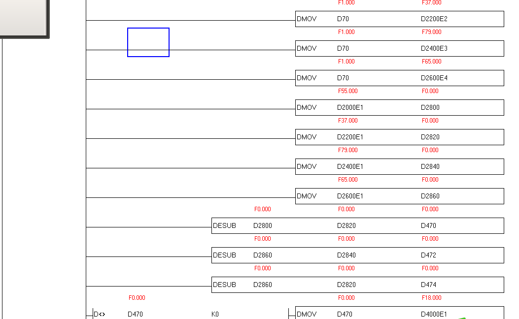![]() 通過E1、E2、E3、E4變址將電機的脈沖數存在D2000、D2200、D2400、D2600連續寄存器內,現在要將對應寄存器的數據進行兩兩相減,要用到哪些指令進行處理。 也就是; 第一部分 D2200-D2000 D2202-D2002 ... D2290-D2090 第二部分 D2600-D2400 D2602-D2402 --- D2690-D2690 |