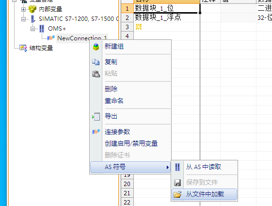 第三步,在WinCC的變量管理對應(yīng)鏈接上右鍵,選擇AS符號,從文件中加載。