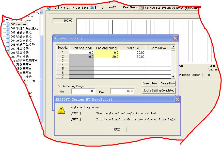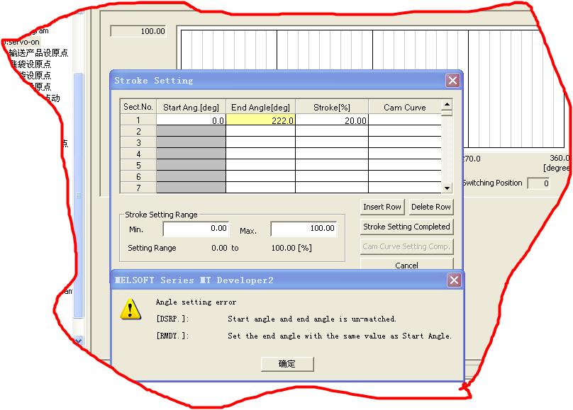 如上圖,為什么我怎么設置起始角度和結束角度還是出錯,并彈出如下菜彈,真是郁悶,三菱杭州公司那邊的人都不知到那里了,今天打電話沒人接,真是的,希望那個用過這軟件的朋友發表一下高見,謝謝!,不知錯在那里?