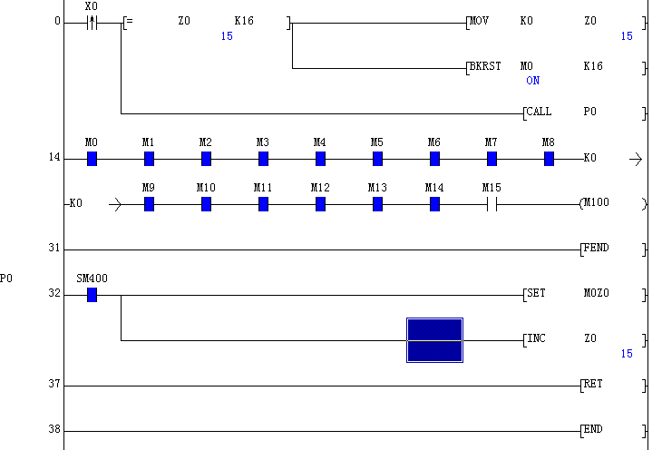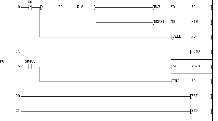改兩句就行。 1、FX沒有BKRST指令,可以用ZRST替換,改成[ZRST M0 M15] 2、FX2N的基本指令不支持變質(zhì),應用指令支持。所以[SET M0Z0]就不能用了。可以用譯碼指令[DECO Z0 M0 K4]。不過這樣寫的話,不用Z0也行,隨便一個字元件,想D100什么的都行。 |