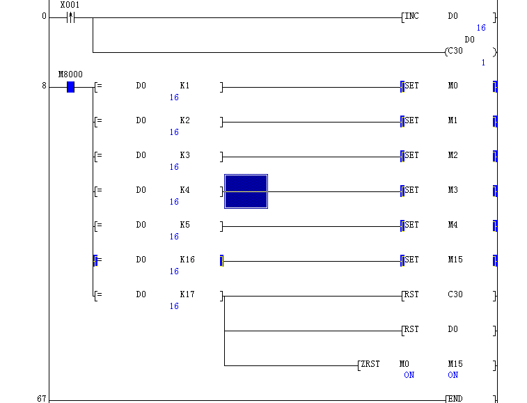 你好,樓上的朋友,用DECO指令,只能使M0-M15輪流被置位(即輸出向下一個高位M移動,而沒有保留以前被置的位);而現(xiàn)在想達到的目的就是當輸入被接通時,M0-M15依次被置位(保留以前被置的位不變).演示結(jié)果如下: ![]() |