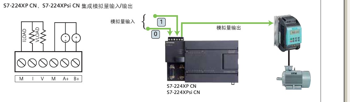 CPU224XP CN自帶2模擬量輸入、1模擬量輸出, 其中A+、B+是2路模擬量輸入端;V、I是1模擬量輸出端,V為電壓輸出,I為電流輸出;M是模擬量的公共端,具體應用你查一下200的產品手冊。