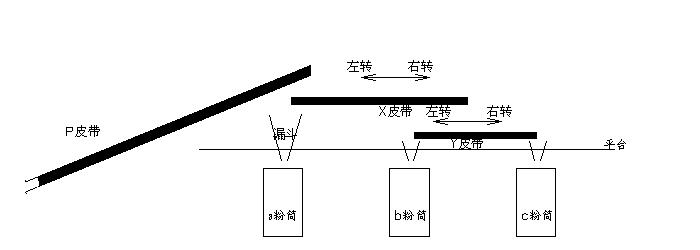 首先abc每個料倉都要兩個料粉檢測開關,(及最少位和最多位)當料粉少于最少位時則開始補充料粉,到最大位時就停止補充料粉,建議每個料倉都要一個單獨的運輸帶,按你上面所說的運輸帶配置,要是abc三個聊倉都同時缺料,那你是先給那個聊倉補充料呢?