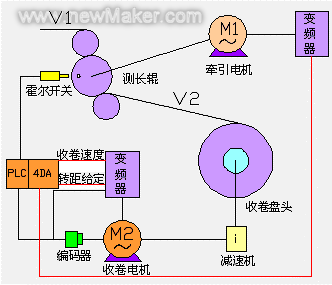 ![]() 轉(zhuǎn)貼開(kāi)環(huán)張力閉環(huán)矢量控制原理以及在紡織行業(yè)應(yīng)用的工藝要求分析 (1)傳統(tǒng)收卷裝置的弊端 紡織機(jī)械如:漿紗機(jī)、漿染聯(lián)合機(jī)、并軸機(jī)等設(shè)備都會(huì)有收卷的環(huán)節(jié)。傳統(tǒng)的收卷都是采用機(jī)械傳動(dòng),因?yàn)闄C(jī)械的同軸傳動(dòng)對(duì)于機(jī)械的磨損是非常嚴(yán)重的,據(jù)了解,用于同軸傳動(dòng)部分的機(jī)械平均壽命基本上是一年左右。而且經(jīng)常要維護(hù),維護(hù)的時(shí)候也是非常麻煩的,不僅浪費(fèi)人力而且維護(hù)費(fèi)用很高,給客戶帶來(lái)了很多的不便。尤其是紡織設(shè)備基本上是開(kāi)機(jī)后不允許中途停車的,如發(fā)生意外情況需要停車會(huì)造成很大的浪費(fèi)。在這種情況下,張力控制變頻收卷開(kāi)始逐漸取代傳統(tǒng)的機(jī)械傳動(dòng)系統(tǒng)。 (2)張力控制變頻收卷的工藝要求 ·在收卷的整個(gè)過(guò)程中都保持恒定的張力。張力的單位為:牛頓或公斤力。 ·在啟動(dòng)小卷時(shí),不能因?yàn)閺埩^(guò)大而斷紗;大卷啟動(dòng)時(shí)不能松紗。 ·在加速、減速、停止的狀態(tài)下也不能有上述情況出現(xiàn)。 ·要求將張力量化,即能設(shè)定張力的大小(力的單位),能顯示實(shí)際卷徑的大小。 (3)張力控制變頻收卷的優(yōu)點(diǎn) ·張力設(shè)定在人機(jī)上設(shè)定,人性化的操作,單位為力的單位:牛頓。 ·使用先進(jìn)的控制算法:卷徑的遞歸運(yùn)算;空心卷徑激活時(shí)張力的線性遞加。張力錐度計(jì)算公式的應(yīng)用;轉(zhuǎn)矩補(bǔ)償?shù)膭?dòng)態(tài)調(diào)整等等。 ·卷徑的實(shí)時(shí)計(jì)算,精確度非常高,保證收卷電機(jī)輸出轉(zhuǎn)矩的平滑性能好。并且在計(jì)算卷徑時(shí)加入了卷徑的遞歸運(yùn)算,在操作失誤的時(shí)候,能自己糾正卷徑到正確的數(shù)值。 · 因?yàn)槭站硌b置的轉(zhuǎn)動(dòng)慣量是很大的,卷徑由小變大時(shí)。如果操作人員進(jìn)行加速減速、停車、再激活時(shí)很容易造成爆紗和松紗的現(xiàn)象,將直接導(dǎo)致紗的質(zhì)量。而進(jìn)行了變頻收卷的改造后,在上述各種情況下,收卷都很穩(wěn)定,張力始終恒定。而且經(jīng)過(guò)PLC的處理,在特定的動(dòng)態(tài)過(guò)程,加入一些動(dòng)態(tài)的調(diào)整措施,使得收卷的性能更好。 · 在傳統(tǒng)機(jī)械傳動(dòng)收卷的基礎(chǔ)上改造成變頻收卷,非常簡(jiǎn)便而且造價(jià)低,基本上不需對(duì)原有機(jī)械進(jìn)行改造。改造周期小,基本上兩三天就能安裝調(diào)試完成。 ·克服了機(jī)械收卷對(duì)機(jī)械磨損的弊端,延長(zhǎng)機(jī)械的使用壽命。方便維護(hù)設(shè)備。 3.4 張力控制系統(tǒng)設(shè)計(jì) (1)變頻收卷的控制原理及調(diào)試過(guò)程 圖4為張力控制系統(tǒng)設(shè)計(jì)。卷徑的計(jì)算原理根據(jù)V1=V2(線速度)來(lái)計(jì)算收卷的卷徑。因?yàn)閂1=ω1*R1, V2=ω2*Rx。(R1-測(cè)長(zhǎng)輥的半徑、Rx-收卷盤頭的半徑) 因?yàn)樵谙?同的時(shí)間內(nèi)由測(cè)長(zhǎng)輥?zhàn)哌^(guò)的紗的長(zhǎng)度(L1、L2)與收卷收到的紗的長(zhǎng)度是相等的。即L1/Δt=L2/Δt → Δn1*C1=Δn2*C2/i(Δn1---單位時(shí)間內(nèi)牽引電機(jī)運(yùn)行的圈數(shù)、Δn2---單位時(shí)間內(nèi)收卷電機(jī)運(yùn)行的圈數(shù)、C1---測(cè)長(zhǎng)輥的周長(zhǎng)、C2---收卷盤頭的周長(zhǎng)、i--減速比) Δn1*π*D1=Δn2*π*D2/i, D2=Δn1*D1*i/Δn2,因?yàn)棣2=ΔP2/P2(ΔP2---收卷編碼器產(chǎn)生的脈沖數(shù)、P2---收卷編碼器的線數(shù)、D1—為測(cè)長(zhǎng)輥直徑、D2—收卷盤頭卷徑). Δn1=ΔP1/P1取Δn1=1,即測(cè)長(zhǎng)輥轉(zhuǎn)一圈,由霍爾開(kāi)關(guān)產(chǎn)生一個(gè)信號(hào)接到PLC.那么D2=D1*i*P2/ΔP2,這樣收卷盤頭的卷徑就得到了。 圖4 張力控制系統(tǒng) (2)收卷的動(dòng)態(tài)過(guò)程分析 要能保證收卷過(guò)程的平穩(wěn)性,不論是大卷、小卷、加速、減速、激活、停車都能保證張力的恒定.需要進(jìn)行轉(zhuǎn)矩的補(bǔ)償.整個(gè)系統(tǒng)要激活起來(lái),首先要克服靜摩擦力所產(chǎn)生的轉(zhuǎn)矩,簡(jiǎn)稱靜摩擦轉(zhuǎn)矩,靜摩擦轉(zhuǎn)矩只在激活的瞬間起作用;正常運(yùn)行時(shí)要克服滑動(dòng)摩擦力產(chǎn)生地滑動(dòng)摩擦轉(zhuǎn)矩,滑動(dòng)摩擦轉(zhuǎn)矩在運(yùn)行當(dāng)中一直都存在,并且在低速、高速時(shí)的大小是不一樣的。需要進(jìn)行不同大小的補(bǔ)償,系統(tǒng)在加速、減速、停車時(shí)為克服系統(tǒng)的慣量,也要進(jìn)行相應(yīng)的轉(zhuǎn)矩補(bǔ)償,補(bǔ)償?shù)牧颗c運(yùn)行的速度也有相應(yīng)的比例關(guān)系.在不同車速的時(shí)候,補(bǔ)償?shù)南禂?shù)是不同的。即加速轉(zhuǎn)矩、減速轉(zhuǎn)矩、停車轉(zhuǎn)矩、激活轉(zhuǎn)矩;克服了這些因素,還要克服負(fù)載轉(zhuǎn)矩,通過(guò)計(jì)算出的實(shí)時(shí)卷徑除以2再乘以設(shè)定的張力大小,經(jīng)過(guò)減速比折算到電機(jī)軸.這樣就分析出了收卷整個(gè)過(guò)程的轉(zhuǎn)矩補(bǔ)償?shù)倪^(guò)程。總結(jié):電機(jī)的輸出轉(zhuǎn)矩=靜摩擦轉(zhuǎn)矩(激活瞬間)+滑動(dòng)摩擦轉(zhuǎn)矩+負(fù)載轉(zhuǎn)矩.<1>在加速時(shí)還要加上