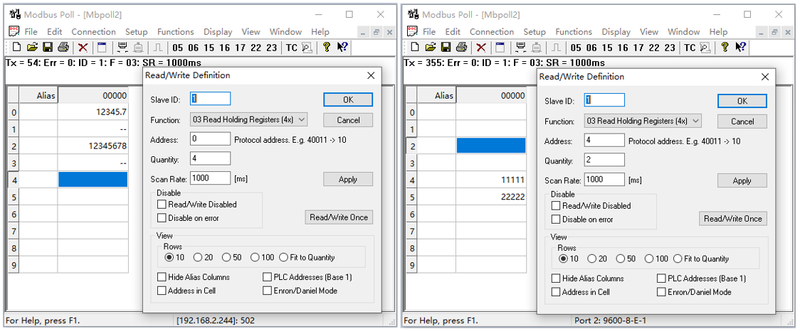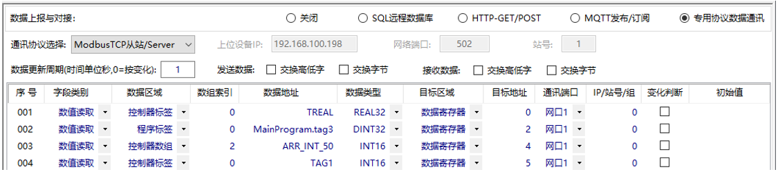 本文是上位機通過Mobus協議緩存方式采用埃和智能網關IGT-DSER,讀寫羅克韋爾(AB)PLC的案例。 IGT-DSER智能網關是一款不用編程即可實現PLC設備對接SQL數據庫、MES等系統平臺的設備,同時也支持將PLC原廠協議轉為Mobus協議,支持ModbusTCP(網絡通訊)和ModbusRTU(串口通訊)的從站。 ![]() 上圖中序號001是PLC內名稱為‘TREAL’的REAL類型的控制器標簽,對應到Modbus地址的HR0(400001); 序號002是PLC內程序名稱為‘MainProgram’的DINT類型的程序標簽,標簽名稱為‘tag3’,對應到Modbus地址的HR2(400003); 序號003是名稱為‘ARR_INT_50’的INT類型的控制器標簽數組,取該數組中的第2個INT,對應到Modbus地址的HR4(400005); 序號004是PLC內名稱為‘TAG1’的INT類型的控制器標簽,對應到Modbus地址的HR5(400006); 參數設置完成后下載重啟后,即可通過上位機主站軟件進行測試,以下是通過Modbus Poll的軟件測試設置和測試的截圖: ![]() 相關資料軟件手冊案列: PLC設備數據采集與協議轉換.rar (4790 K) 下载次数:66 |