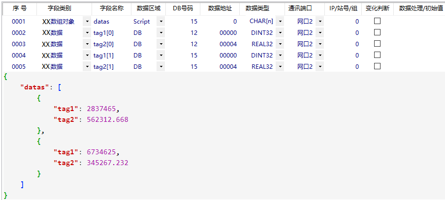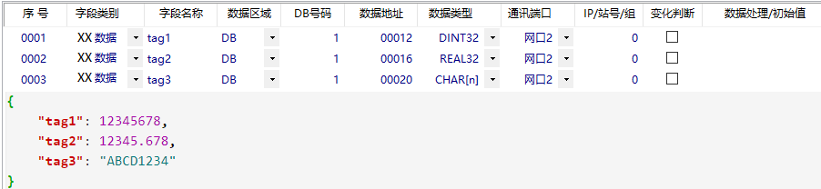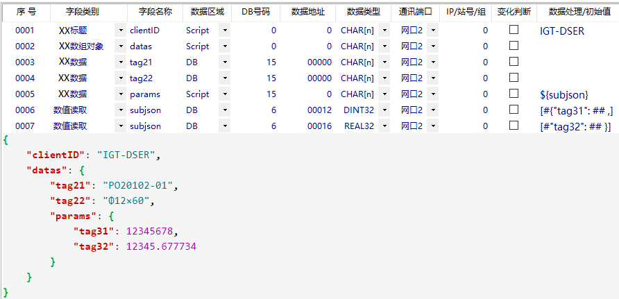 以下是數(shù)據(jù)配置表自動生成的JSON文件的對應(yīng)。JSON文件內(nèi)的數(shù)據(jù)可以自由增減,字符可自由修改,舉例只是為了描述各種JSON文件的結(jié)構(gòu)實現(xiàn)。MQTT協(xié)議的發(fā)布/訂閱也是同樣的對應(yīng)方式。具體如下: