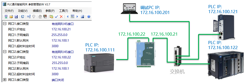 IGT-DSER智能網關的兩個網口設置為不同的網段,同時開啟網口3設置為第三網段,該智能網關沒有實際的物理網口3,自動將IP綁定到物理網口2,作為網口2的第二IP。