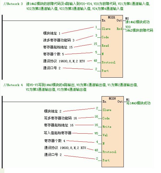 2、 使用485網絡將模擬量模塊作為遠程IO使用時不占用AI/AQ通道個數,每個485網絡可以連接30個模塊,在程序中使用Modbus讀指令MODR和Modbus寫指令來訪問,如下圖: