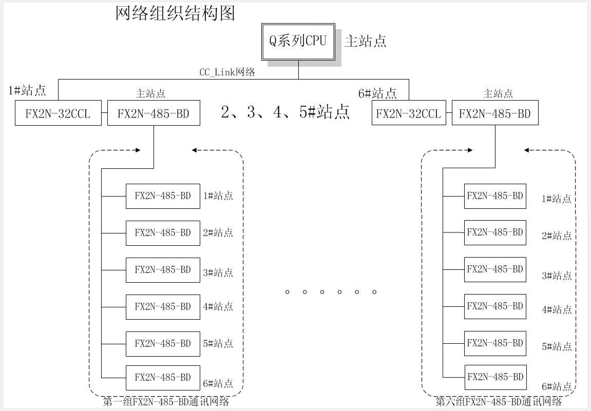 下面是NN網絡,利用485bd模塊組成的,中間和上面是利用FX模塊和Q系列的模塊組成的CC-LINK網絡,他上面少畫了Q系列模塊