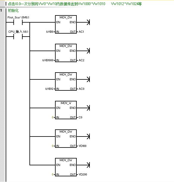 我是初學(xué)PLC的,現(xiàn)在想做這樣一個程序,就是I0.0接通一次,把VW0到VW10寫進VW1000到VW1010,在接通一次把VW0到VW10寫進VW1012到VW1022,依次類推。