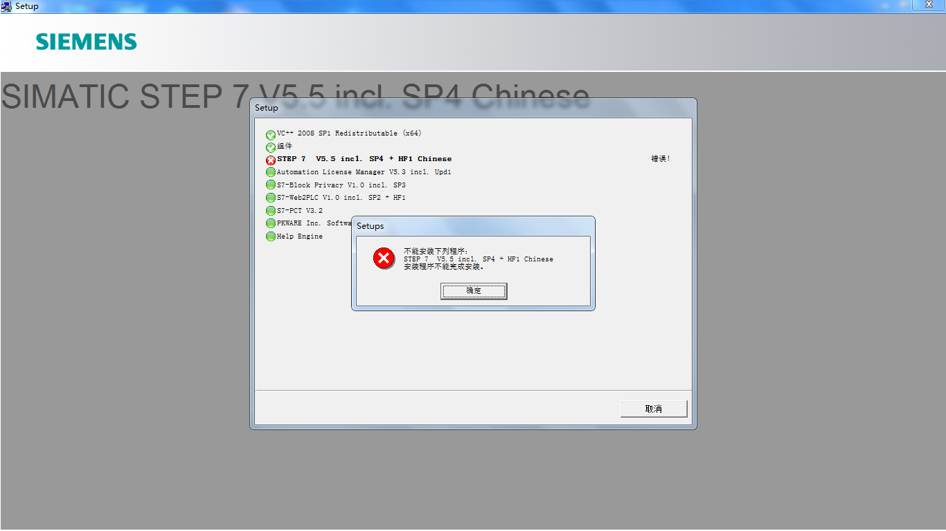安裝S7 V5.5時,總在第3步時報錯,不知該怎么解決。如下圖所示: