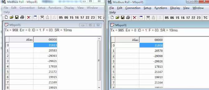 通過標(biāo)準(zhǔn)Modbus客戶端進(jìn)行通訊測(cè)試,同時(shí)采集2臺(tái)PLC的數(shù)據(jù),IP:192.168.1.188,通過端口502和503區(qū)分