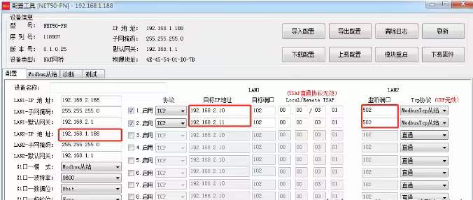 1、2臺(tái)S7-200 SMART的PLC的IP地址,同時(shí)映射到IP:192.168.1.188,通過端口502和503區(qū)分;