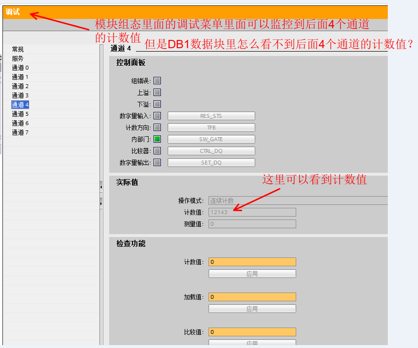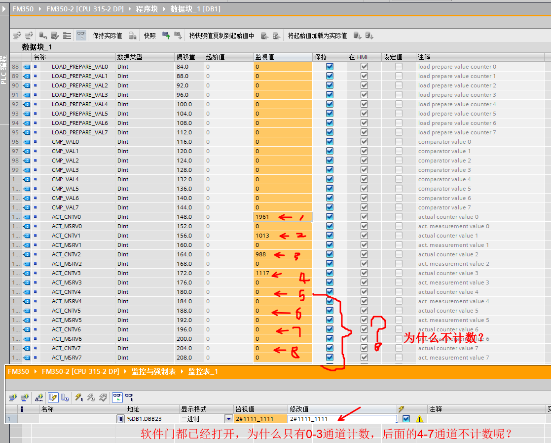 1.接的是歐姆龍24v增量編碼器,把A相分別接到1--4通道進行測試,旋轉編碼器,DB1里面的1--4通道的當前計數值有變化,可以采集到計數值,但是接到5---8通道中,旋轉編碼器,DB1里面就不顯示計數值,但是右擊模塊進入調試里面,能看到5---8通道在計數,但是DB1的數據塊里,怎么沒有計數值?