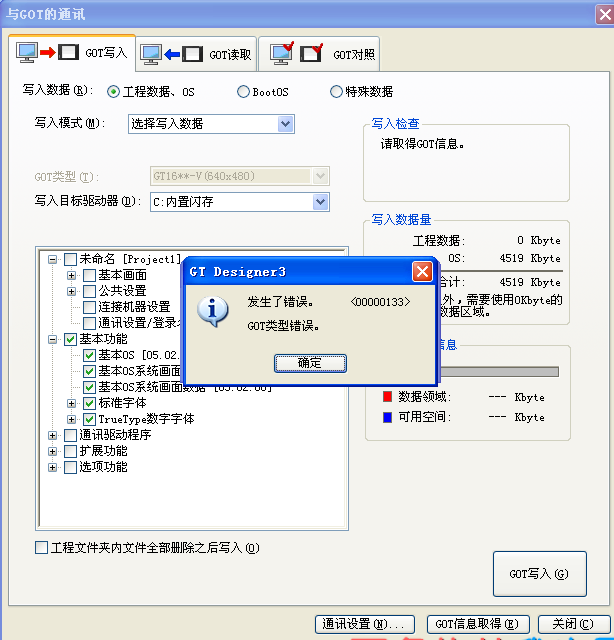 有一個三菱GT1675-VNBA人機,在GT3軟件選擇機種為GT16**-V(640X480),在下載基本OS提示GOT類型錯誤,通信測試連接正常,請指教是什么問題。