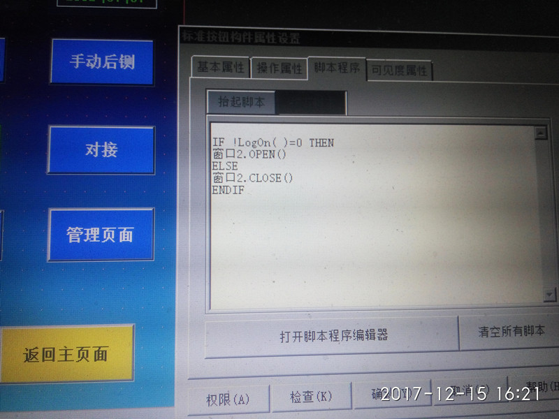 各位高手好,用昆侖通態觸摸屏,其中一個頁面要密碼登錄才能打開,我在這個按鈕(管理頁面按鈕)屬性上寫了個腳本程序,模擬打開時密碼正確可以打開,但是在輸入密碼彈出框里如果不輸入密碼,直接點取消,或者輸入密碼錯誤后點“否”按鈕  ,都能進入這個登錄頁面,求高手指導一下什么原因?我寫的腳本程序是: