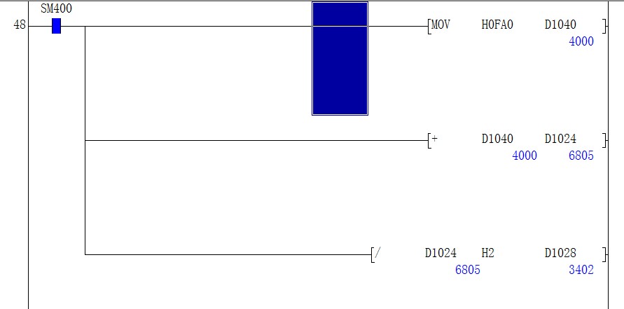 如上圖,D1024中數據為2800-2810某一數值波動,需要將(此數值+4000)/2后存入D1028中與其他數據比較。