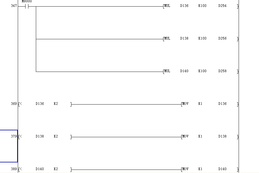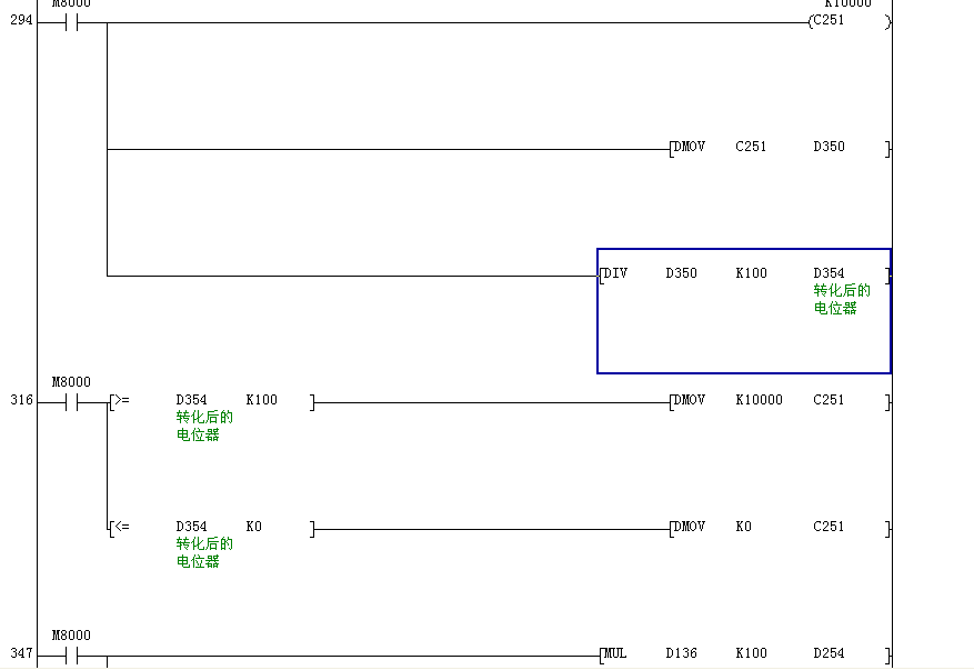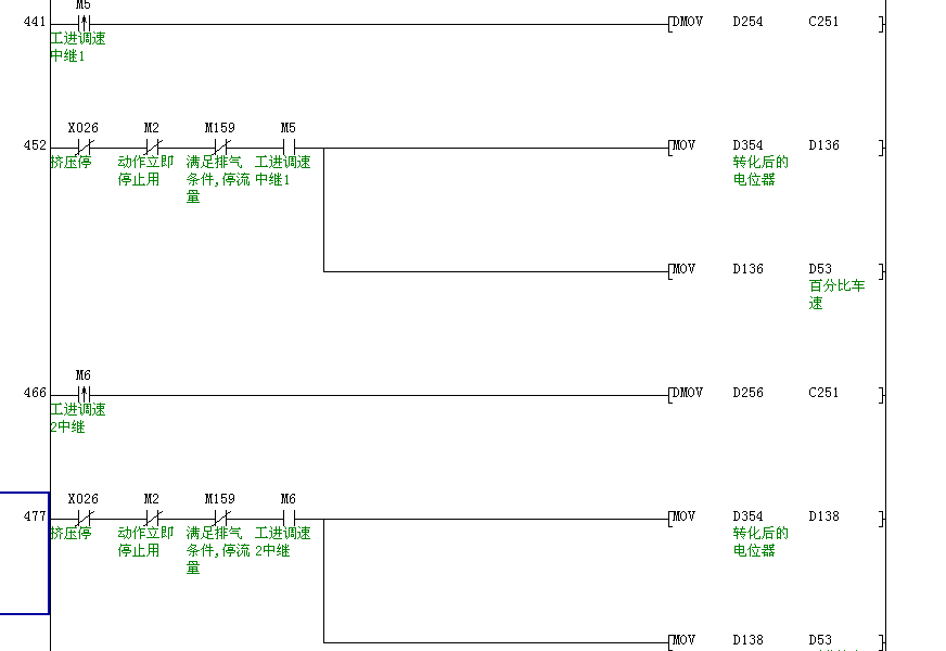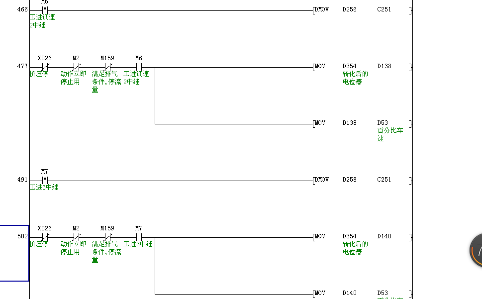 是關于編碼器的一段程序,我剛開始學習plc,找了很多資料都看不懂是什么意思,程序大概的意思應該是在一段距離內,轉動編碼器,可以控制油泵的流量,起到調節油缸的速度,在另外一段距離,可以從復上面的調速。在從復一次,一共三個距離,三段調速。希望看懂的可以給我指點指點,非常感謝!!!