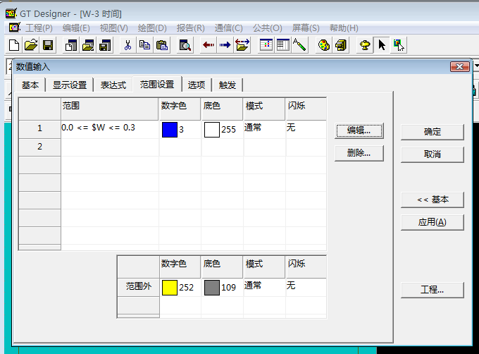 1 數值輸入屬性,‘擴展功能’選定‘選項’,‘控制范圍’->‘上限值’‘下限值’ -> ‘軟元件’ 對應 兩個D寄存器 2 另外畫兩個‘數值輸入’控件 對應‘上限值’D寄存器和‘下限值’D寄存器 |