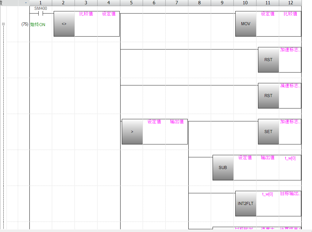 IF 比較值<>設定值 THEN 比較值:=設定值; 加速標志:=FALSE; 減速標志:=FALSE; IF 設定值>輸出值 THEN 加速標志:=TRUE; t_w[0]:=設定值-輸出值 INT2FLT( 1 , t_w[0] , 目標輸出 ); END_IF; END_IF; 大概是這樣 |