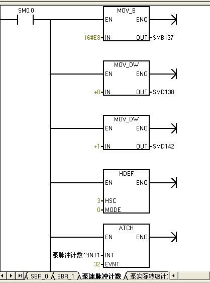 奶奶,終于搞定這程序了,大概意思就是先通過(guò)一個(gè)PTO定時(shí)輸出,高速計(jì)數(shù)器每收到一個(gè)脈沖信號(hào)后產(chǎn)生中斷,中斷后當(dāng)前值減去上一次中斷的的計(jì)數(shù)值,1分鐘時(shí)間除于這次收到脈沖信號(hào)的時(shí)間值=每分鐘可以接到的脈沖數(shù),也可以說(shuō)是轉(zhuǎn)速