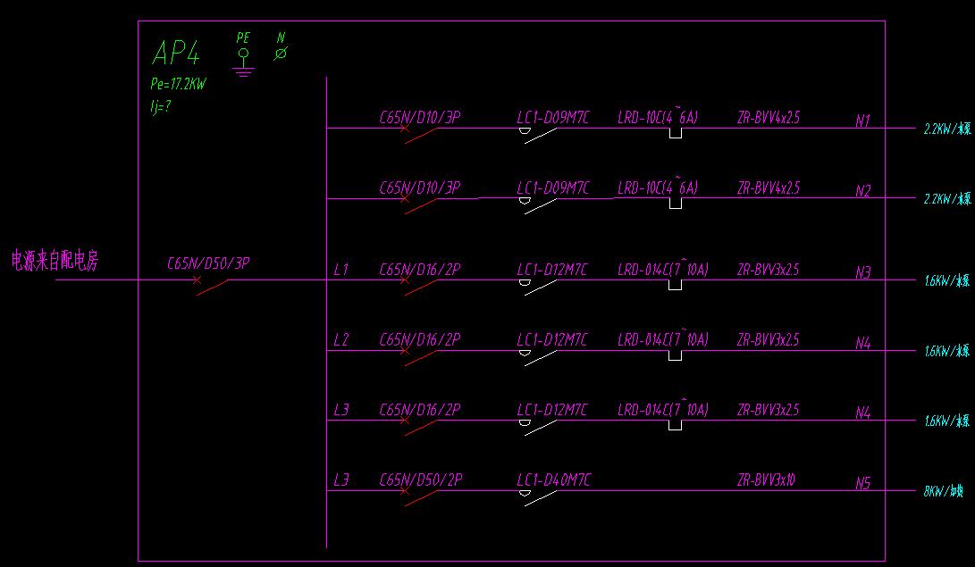 問題出現了:L3相8KW/加熱,其計算電流:Ijs=45A,(8/0.22x0.8).上面所選的總開就沒法用;