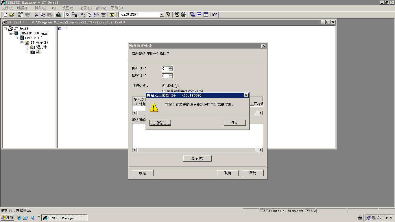 [原來的電腦壞了,后來換了臺,IP地址設(shè)置和過去一樣的,pc/pg接口也設(shè)置了該電腦的網(wǎng)卡接口。就是連不上。圖片的文字是 在線:在裝載的通訊驅(qū)動程序中功能未實現(xiàn)。 (33:17089) |