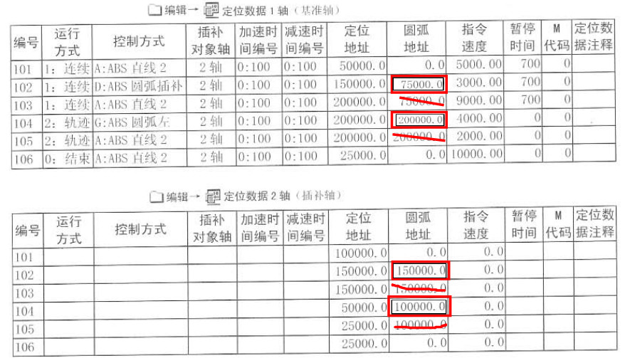 三菱QD75定位模塊官方教材有錯誤的地方,我看按照圖上的軌跡運行,軸1和軸2插補控制錯在圓弧的輔助點和中心的,參數數據的設置的錯誤,不知道是不是我理解錯了,還是教材就是有錯誤,