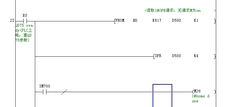 QD75定位控制監視數據怎么在編程中體現,我在編程中看到:第一條語句:FROM H0 K817 D500 K1;(讀取1軸的尋零請求,無請求M為on)