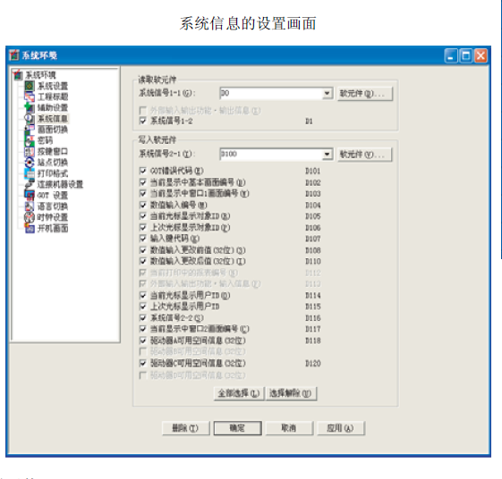 可能PLC中將用戶ID編號數值寫給Z1,再由Z1切換[DMOV D540Z1 D118]中源地址,使得D118顯示值一直跟隨你的輸入變化。 用戶ID是你自己設定的數值,他是和目標ID配合使用用來確定光標位置的。 如果在“系統環境設置”的“系統信息”選中了“當前光標顯示用戶ID”,那么就可以將自定義的用戶ID編號告知PLC。由此達到控制的目的。 ------------------------- 你可以在PLC程序中找找Z1的數值是由哪個地址傳輸給他的;然后到GOT程序中找找系統信息中“當前光標顯示用戶ID”對應的地址是多少。再看看兩者是否一致,或是否有聯系。 |