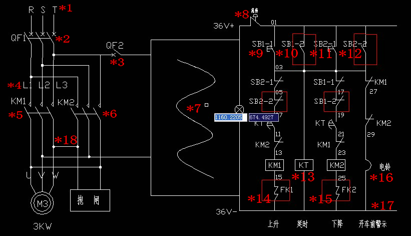 *14:—*15:“FK1”和“FK2”所示的圖形符號與文字符號是哪一類的器件?我個人猜測,可能是“熔斷器”。如果是熔斷器,圖形符號與文字符號的標注是錯誤的。其文字符號是:FU1、FU2。況且,在這個控制系統中使用一個即可。該圖形符號繪制的位置:36V+端與急停按鈕前端之間。