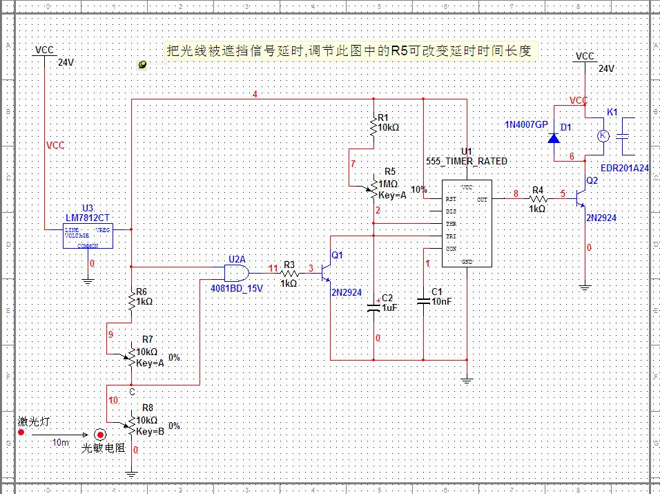 用玩具激光燈發(fā)射光束,光敏電阻接受。此實(shí)驗(yàn)是在室內(nèi)有照明燈時(shí)進(jìn)行。當(dāng)激光燈發(fā)射光束照在光敏電阻上時(shí),光敏電阻的阻值為幾百歐姆或更小;當(dāng)沒(méi)有激光燈發(fā)射光束照在光敏電阻上,但有室內(nèi)照明燈光時(shí)(非直射),光敏電阻的阻值為十K左右;當(dāng)用手捂住光敏電阻時(shí),光敏電阻的阻值為幾十K或上百K。由于室內(nèi)范圍有限,測(cè)試距離為10米。