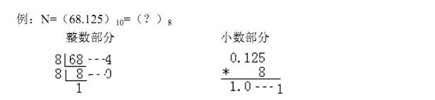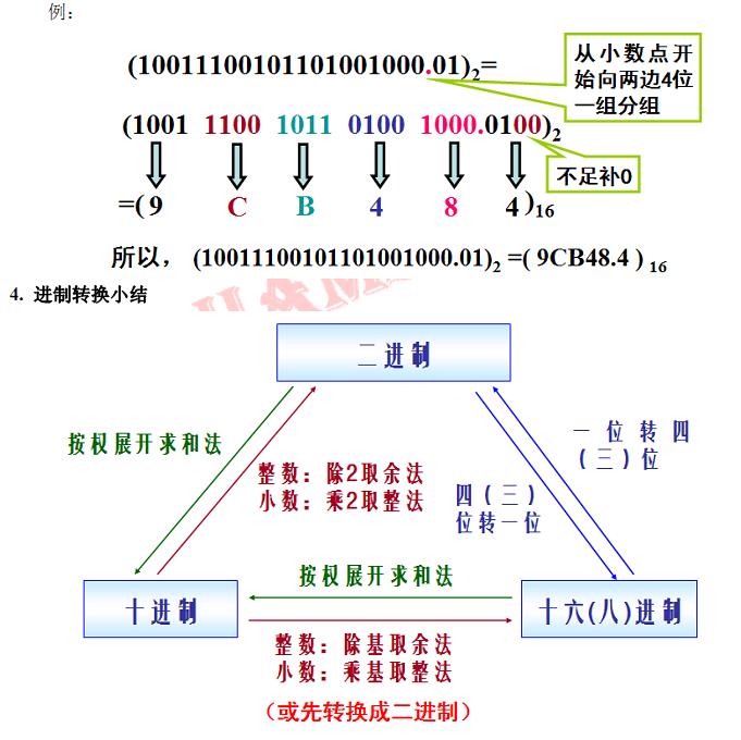 3- 不同數制之間的轉換 1. 其它進制轉換為十進制 方法是:將其它進制按權位展開,然后各項相加,就得到相應的十進制數。 例1: N=(10110.101)B=(?)D 按權展開N=1*24+0*23+1*22+1*21+0*20+1*2-1+0*2-2+1*2-3 =16+4+2+0.5+0.125 =(22.625)D 例2: N=(532.8)H=(?)D 按權展開N=5*162+3*161+2*160+8*16-1 =1280+48+2+0.5 =(1330.5)D 2. 將十進制轉換成其它進制 方法是:將十進制數分整數部分和小數部分分別計算。 整數部分:(基數除法) 把我們要轉換的數除以新的進制的基數,把余數作為新進制的最低位; 把上一次得的商在除以新的進制基數,把余數作為新進制的次低位; 繼續上一步,直到最后的商為零,這時的余數就是新進制的最高位。 注意:小數部分取整的過程,不一定能使最后乘積為0,因此轉換值存在誤差。通常在二進制小數的精度已達到預定的要求時,運算便可結束。 3. 二進制與八進制、十六進制之間的轉換 八進制數和十六進制數的基數分別為8=23,16=24, 所以三位二進制數恰好相當一位八進制數,四位二進制數相當一位十六進制數,它們之間的相互轉換是很方便的。 二進制數轉換成八進制數的方法是從小數點開始,分別向左、向右,將二進制數按每三位一組分組(不足三位的補0),然后寫出每一組等值的八進制數。 二進制數轉換成十六進制數的方法和二進制數與八進制數的轉換相似,從小數點開始分別向左、向右將二進制數按每四位一組分組(不足四位補0),然后寫出每一組等值的十六進制數。 例: ![]() |