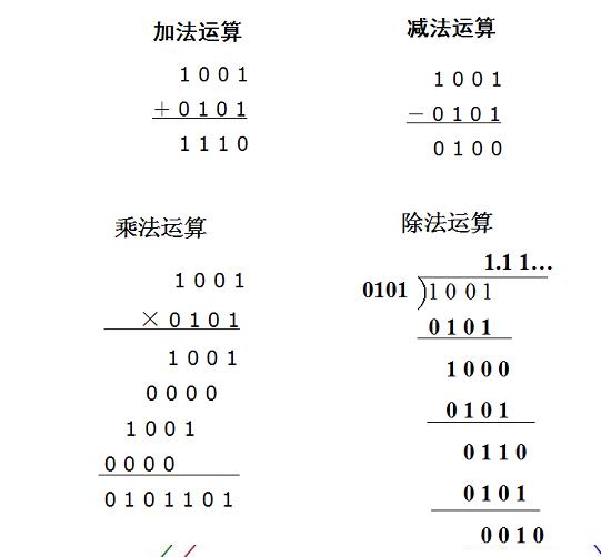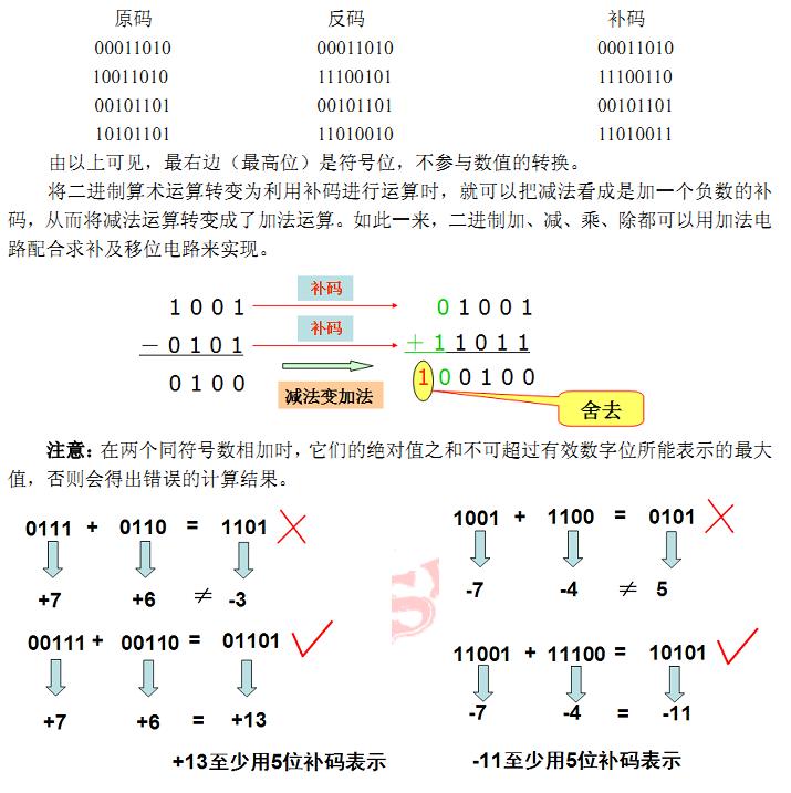 4- 二進制算術運算 當兩個數碼分別表示兩個數量大小時,它們可以進行數量間的加、減、乘、除等運算。這種運算稱為算術運算。 因電腦和數字設備普遍采用二進制運算,本節只探討二進制的算術運算。 1. 二進制算術運算的特點 二進制算術運算和十進制算術運算規則基本相同,區別是“逢二進一”。 由上圖可見二進制的乘法和除法有以下特點: 二進制的乘法運算可以通過若干次的“被乘數(或0)左移1位”和“被乘數(或0)與部分積相加”這兩種操作完成; 二進制數的除法運算能通過若干次的“除數右移1位”和“從被除數或余數中減去除數”這兩種操作完成。 如果我們能設法將減法操作轉化為某種形式的加法操作,那么加、減、乘、除運算就全部可以用"移位"和"相加"兩種操作實現了。為了解決這個問題,計算機引入了原碼、反碼和補碼的概念。 2. 原碼、反碼、補碼和補碼運算 二進制數的正、負表示方法通常采用的是在二進制數的前面增加一位符號位。這種形式的數稱為原碼。符號位為0表示這個數是正數,符號位為1表示這個數是負數。其余各位表示數值。 在做減法運算時,如果兩個數是用原碼表示的,則首先需要比較兩數絕對值的大小,然后以絕對值大的一個作為被減數、絕對值小的一個作為減數,求出差值,并以絕對值大的一個數的符號作為差值的符號。 這個操作過程比較麻煩,而且需要使用數值比較電路和減法運算電路。如果用兩數的補碼相加代替上述減法運算,則計算過程中就無需使用數值比較電路和減法運算電路了,從而使減法運算器的電路結構大為簡化。 補碼的原理可參考其他電子書籍,正負數的反碼和補碼的計算原則如下: 反碼:正數的反碼等于原碼,負數的反碼:符號位不變,以下各位按位取反。 補碼:正數的補碼等于原碼,負數的補碼:符號位不變,以下各位按位取反,最后加1。一個數補碼的補碼即為其原碼。 例:帶符號位二進制數00011010(+26)、10011010(-26)、00101101(+45)、和10101101(-45)的反碼和補碼。 在計算機系統中,數值一律用補碼來表示(存儲)。 補碼的優點主要有: 使符號位能與數值位部分一起參加運算,從而簡化運算規則; 使減法運算轉換為加法運算,從而簡化計算機中運算電路的設計; 兩個用補碼表示的數相加時,如果最高位(符號位)有進位,則進位被舍棄; 補碼轉換為對應的十進制數時正負數規則一樣 ; 0的補碼是唯一的。如0的5位補碼是00000。 |