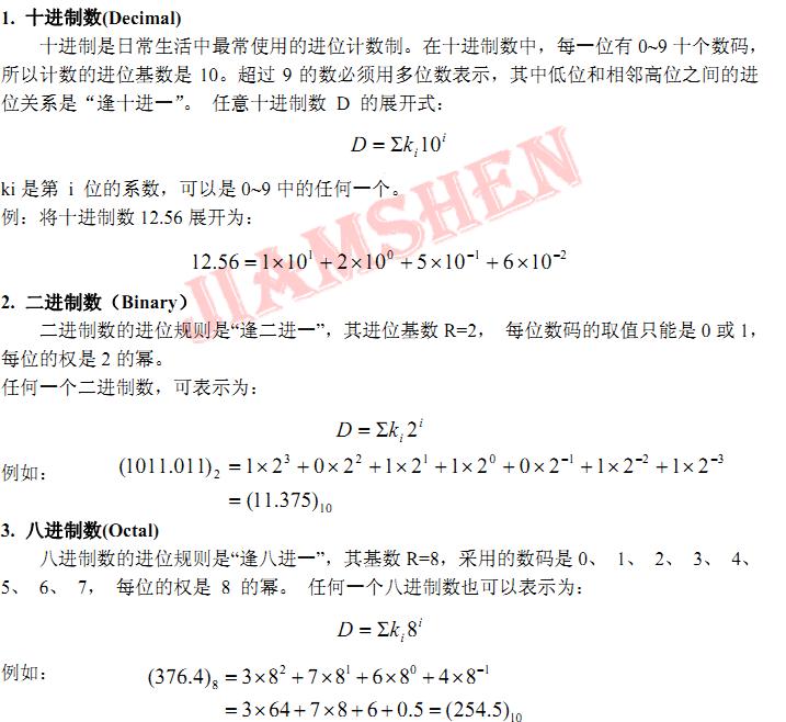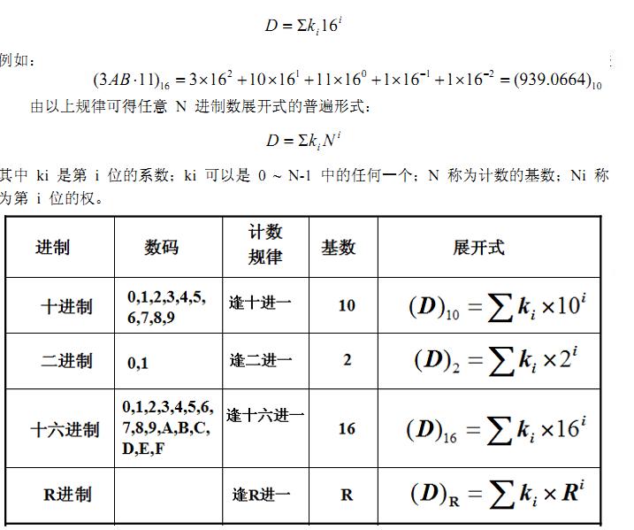 這應該用圖片傳上來,實際應該是n次方,請注意: 例1: N=(10110.101)B=(?)D 按權展開N=1*24+0*23+1*22+1*21+0*20+1*2-1+0*2-2+1*2-3 =16+4+2+0.5+0.125 =(22.625)D 例2: N=(532.8)H=(?)D 按權展開N=5*162+3*161+2*160+8*16-1 =1280+48+2+0.5 =(1330.5)D |
