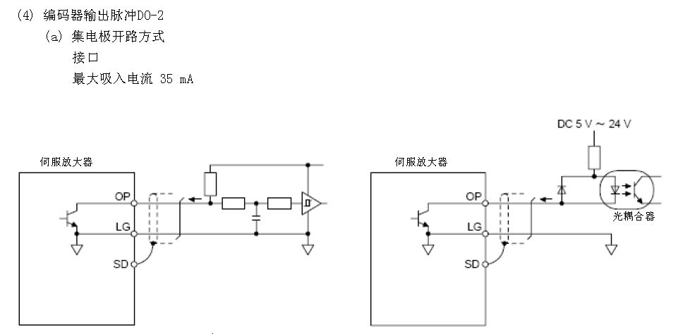 引用引用第1樓長沙林工于2013-08-22 14:37發表的 :MR-JE-A伺服放大器技術資料集3-54頁,用光耦連接放大器OP-LG端子,外加DC5-24V電源,再與PLC的高速計數器輸入端相連,可讀出電機的脈沖。上圖沒有成功,自己去看。