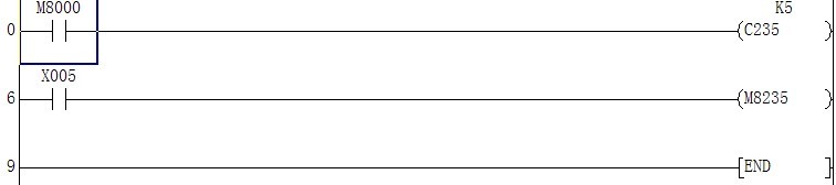 使用方法和1S/1N/2N一樣的。假如你用C235,用一個(gè)指令如LD M8000 OUT C235 這樣你給X0脈沖就是上計(jì)數(shù)。如果接通了M8235就是減計(jì)數(shù)了 |