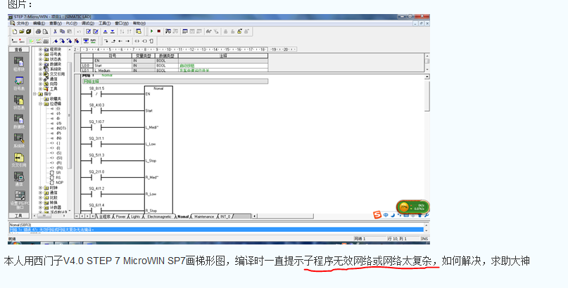 本人用西門子V4.0 STEP 7 MicroWIN SP7畫梯形圖,編譯時一直提示子程序無效網絡或網絡太復雜,如何解決,求助大神