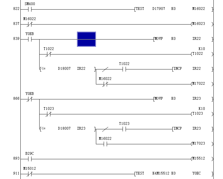 如果截圖的這段程序不是子程序或者中斷程序的話 那么PLC上電就開始測試D17907里面的數據的第一個位也就是D17907的B0位 根據D17907存儲數據的大小它第一個位的狀態會不同 0或者1  假設D17907現在存儲數值為1 那么M16022為ON M16022為ON 那么M16023為OFF 然后判斷Y0EB的狀態 Y0EB為ON時先清零文件寄存器ZR22   T1022為1秒周期的震蕩脈沖 然后判斷D18007里面的數據和ZR22的大小 D18007小于等于ZR22才ON 當ZR22大于D18007時為OFF 因為先清零 所以ZR22為0 一般寄存器不太會存負數 所以ZR22一定小于D18007 那么就OFF 之后取反指令 運算結果取反 為ON   1秒為周期ZR22加1 當ZR22等于D18007里面的數值時停止加1  當M17907的第一個位為0時 M16022為OFF 那么當Y0EB 為ON并且D18007里面的數值小于等于ZR22時M17022為ON   打得煩了  剩下的自己研究吧 唯一特別點的就是用了個TEST測試指令