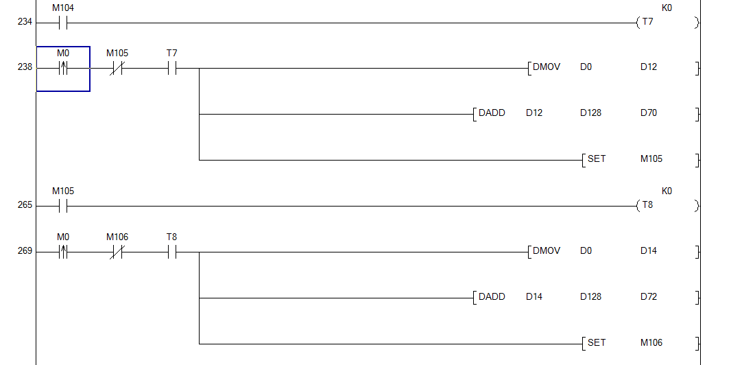 先工藝有兩道工序 ,第二工位受第一工位控制,當第一工位有產品(感應器檢測)延遲一定時間T,到達第二工位,第二道工序動作;目前編寫的程序可以實現,但是第二工位會出現遺漏,程序如下,現考慮用SFTR指令 哪位大神有做過類似的,麻煩給點思路,謝謝!PLC三菱的