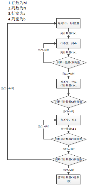 第一行X不變,每走一格Y+列間距同時記錄格數,已走格數=設定格數 ,然后X+行間距同時記錄行數,,每走一格Y-列間距同時記錄格數-1